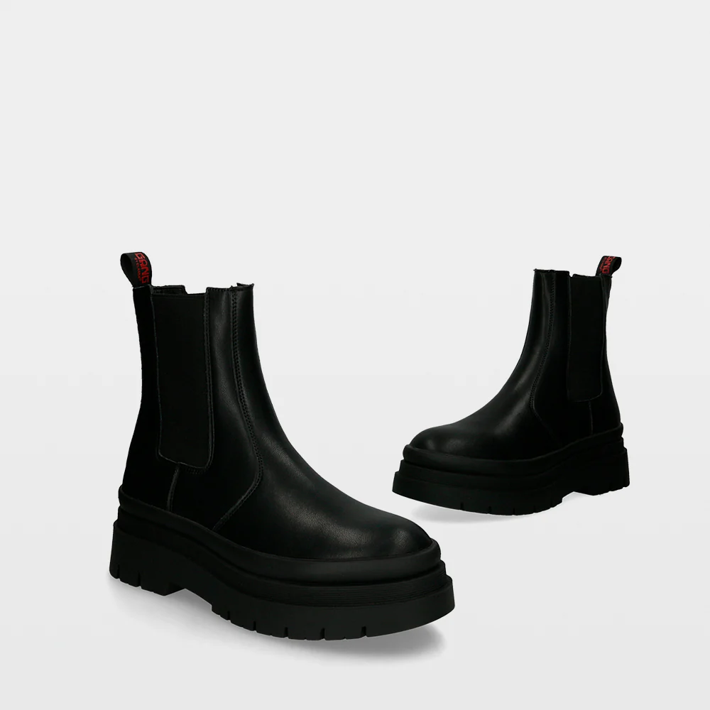 Botín estilo Chelsea. Tirador trasero y gomas laterales. Fabricado en piel de primera calidad. Suela de plataforma recta de 5 cm.