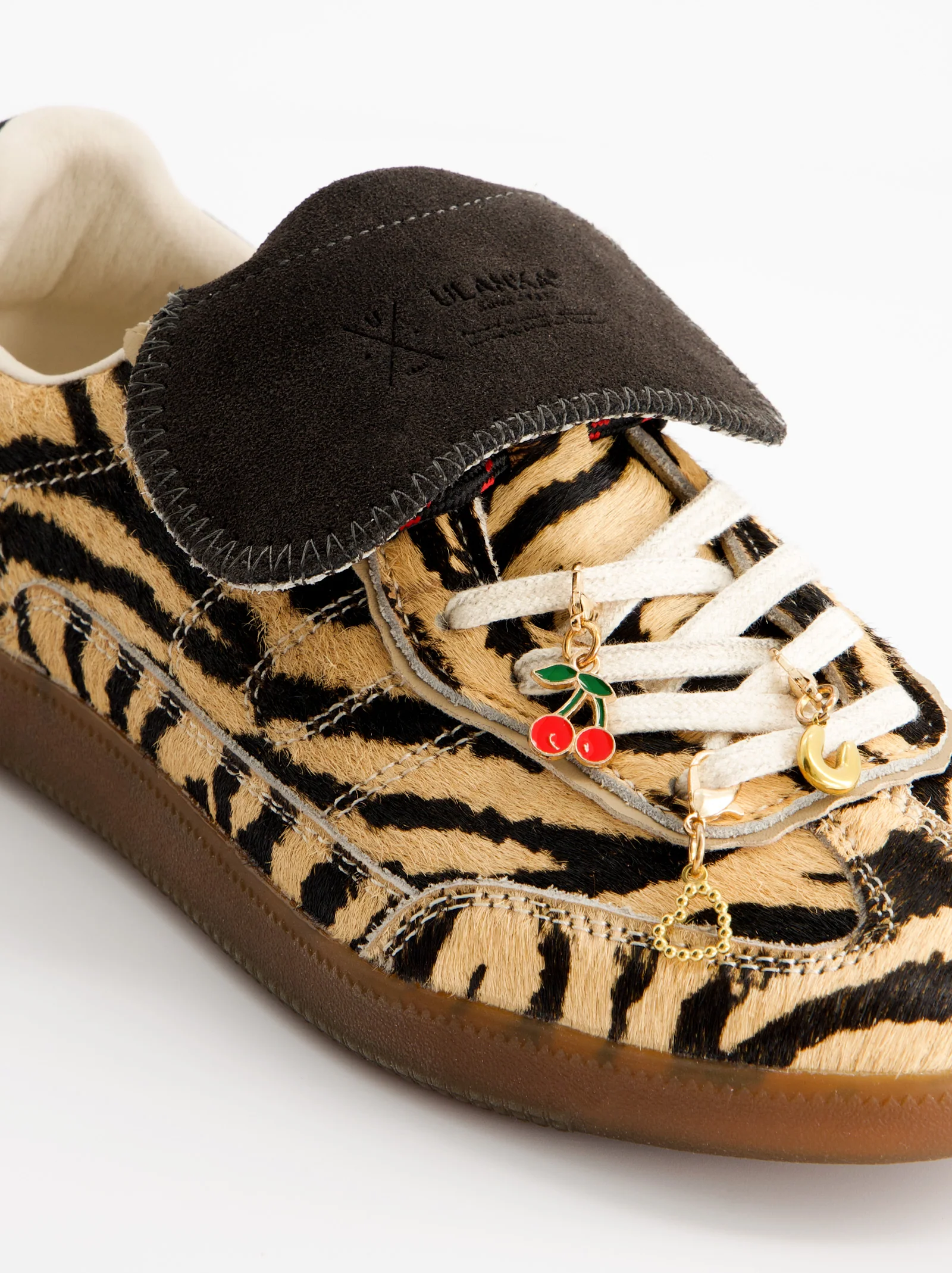 Zapatillas con estampado animal print y lengüeta decorativa multiposición. Cierre con cordones de algodón y charms decorativos. Fabricadas en piel. Suela de goma de 2 cm.