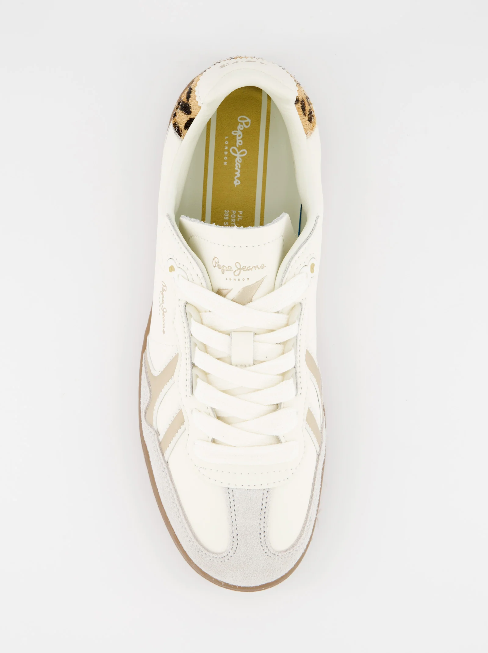 Zapatillas confeccionadas en piel de vacuno. Detalle de ante en puntera. Cierre de cordones con anillas en forma de D. Logo en relieve PEPEJEANS en laterales. Ojal personalizado con monograma P. Detalle animal print en talón. Logo en relieve 1973 en el talón. Suela exterior de goma traslúcida. Dimensiones: 26 cm x 9,2 cm x 6,2 cm. Fabricado con materiales sostenibles.