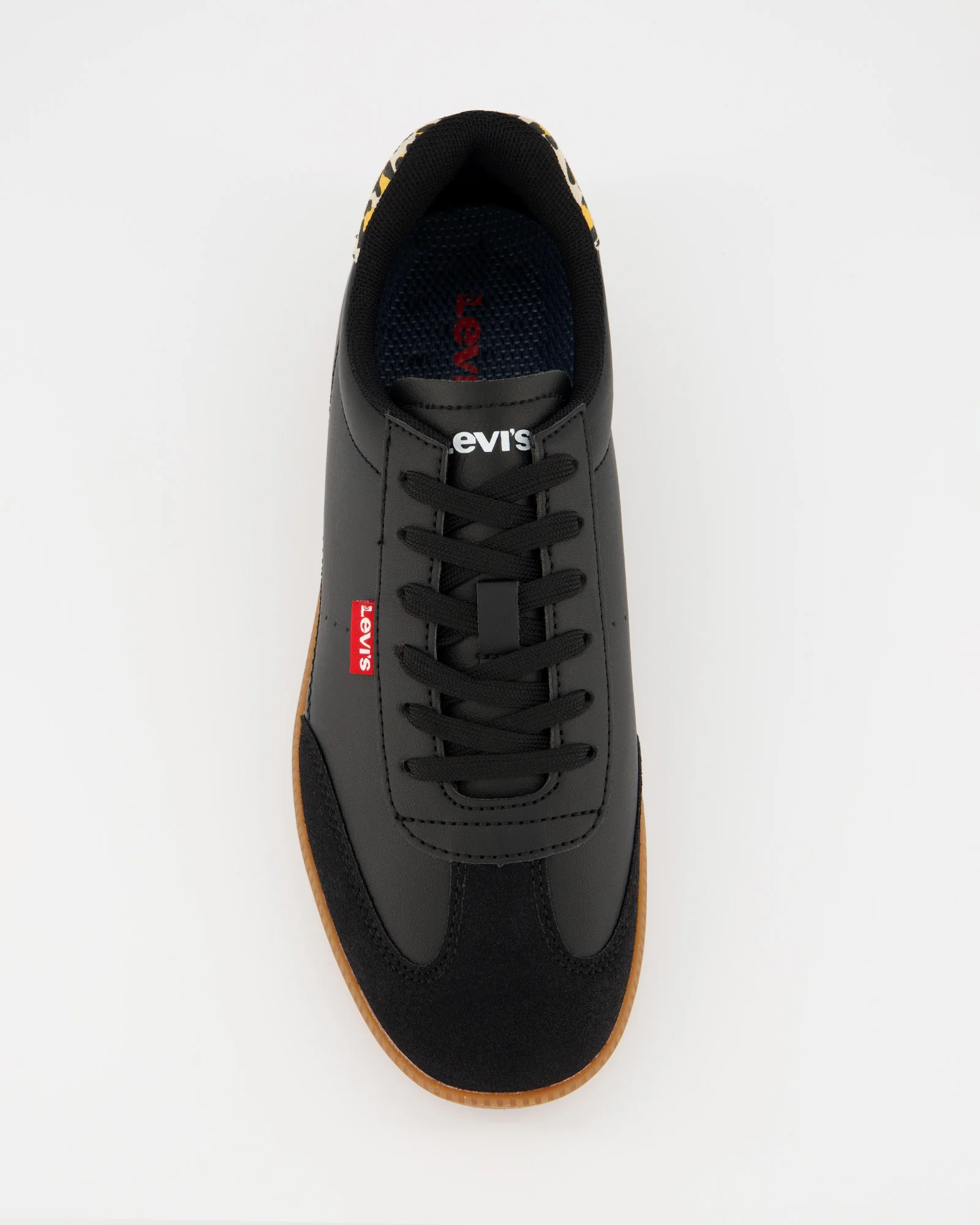 Zapatillas deportivas casual de color negro. Fabricadas en piel sintética. Talonera con estampado animal print. Suela de goma color caramelo.